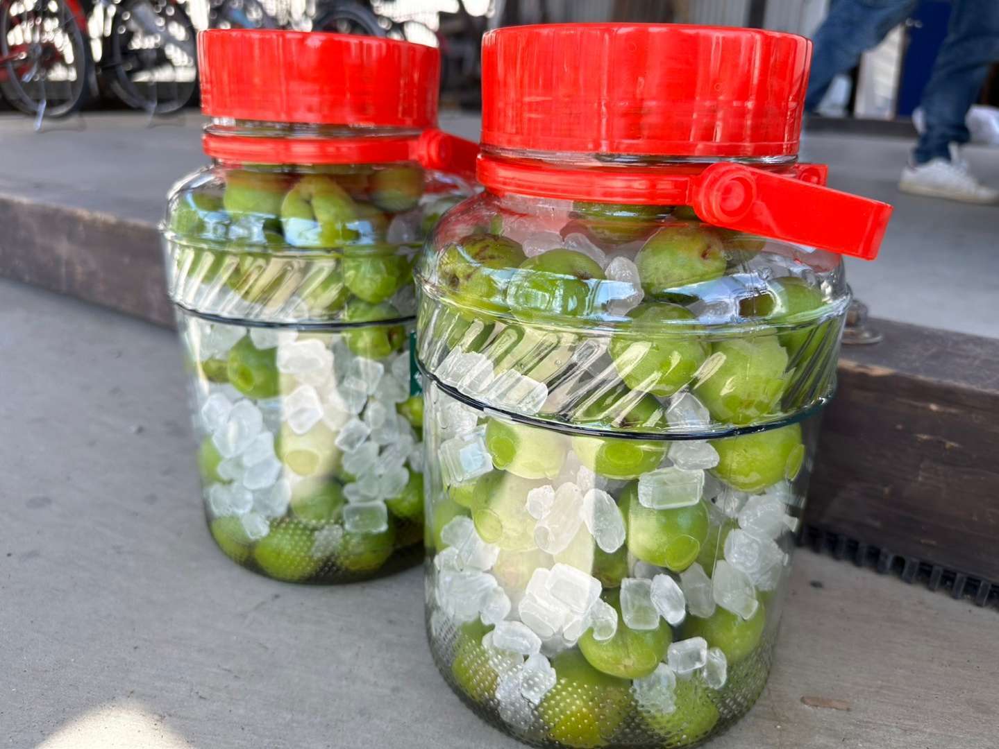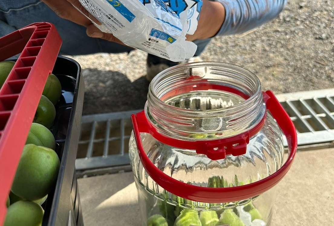 氷砂糖と梅をいれ、お酢をふりかけ、完成である。